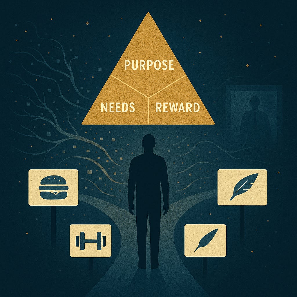 These needs span a wide range: physiological (such as nutrition, rest, physical integrity), cognitive (like competence, exploration, aesthetics), and social (including affiliation, dominance, nurturing, legitimacy), among others. However, it's crucial to note that our behaviour is primarily motivated by anticipated rewards, essentially models of these needs. These models, or purposes, are well encapsulated in Maslow's hierarchy. Unlike straightforward needs, which elicit direct pleasure or pain responses, purposes establish hierarchies to reconcile conflicting desires (for instance, the craving for a burger versus the aspiration to maintain a healthy weight). Every individual possesses a unique internal hierarchy of purposes. When our decisions align with these purposes, we are exercising free will.